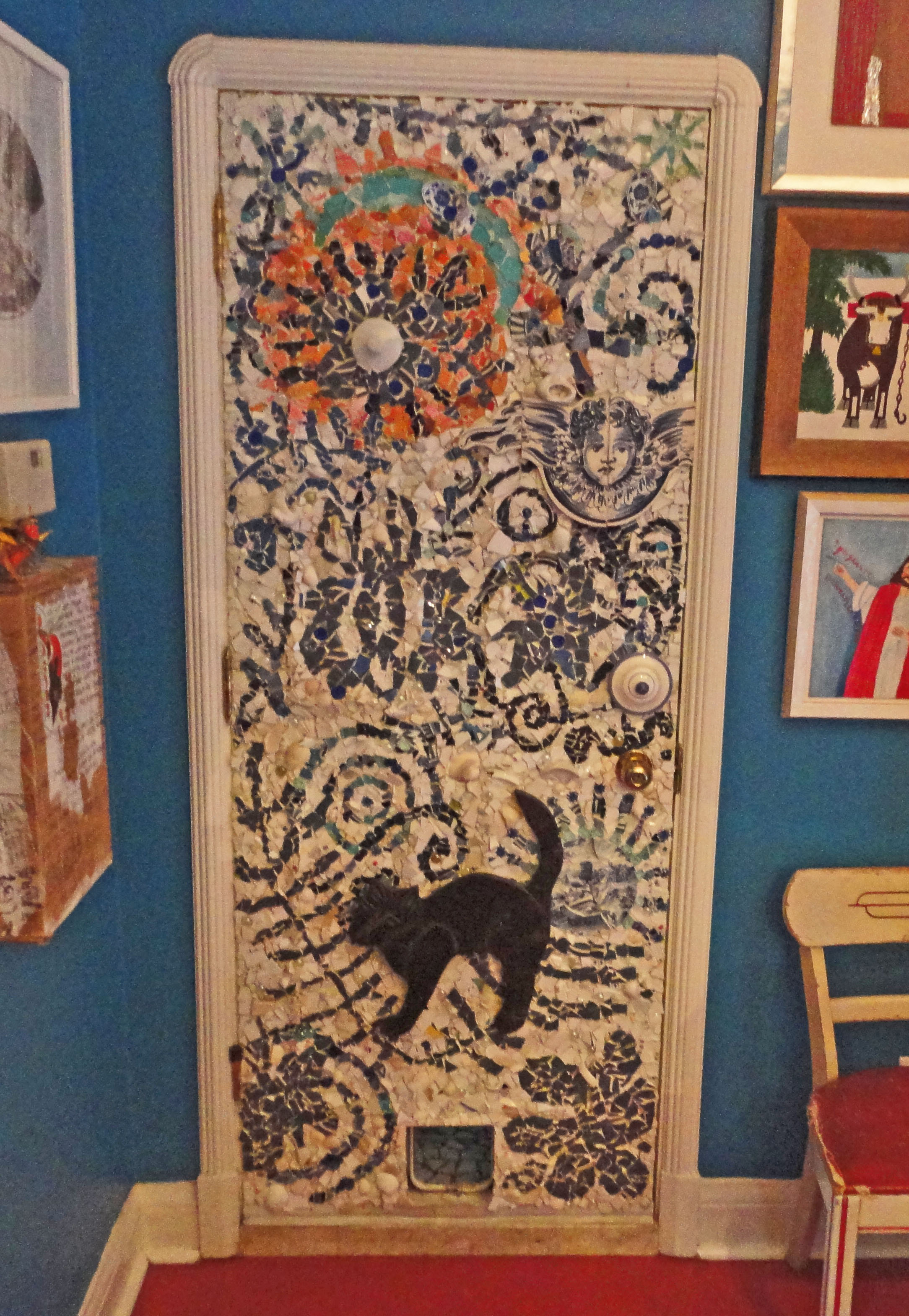 DSC04815Tuffy P has just completed this fantastic dining room door mosaic. It features some tiles from Sintra, in Portugal, a black cat from Nice Old Stuff in Jarvis Ontario, and a cat door to allow the lions to pass at their leisure.