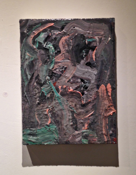 Peter’s colours are deceptive. There is a predominate earthiness throughout the exhibition, and yet within each individual painting, there are areas of rich colour that became more obvious to me the more I looked at these paintings. I spent quite a while looking at the show this afternoon, and a number of the paintings – in particular the smaller ones in the group – kept drawing me back in.