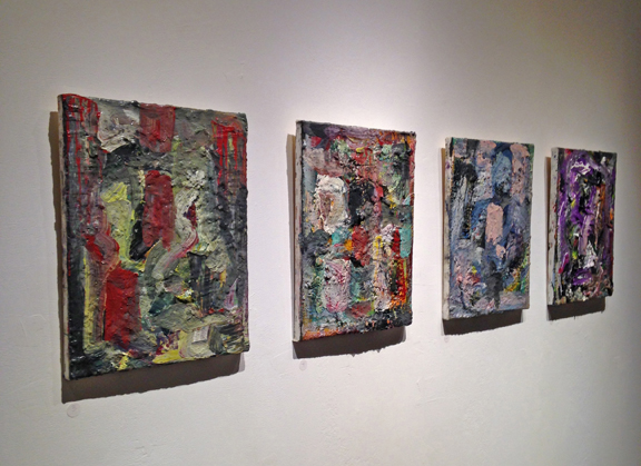 Peter has made a set of tasty, painterly works for this exhibition, rich in texture with images and colours that seem to emerge from the act of painting.
