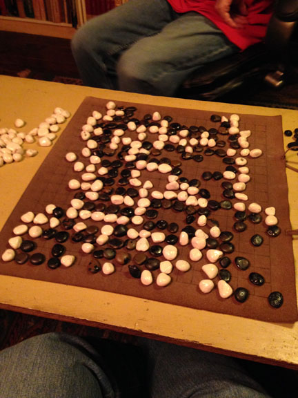 Last night we played a number of well-fought games. The highlight for me was a big kill in which I trapped a large group of Vox’s stones, perhaps 15 or 16 of them, blocking their escape and destroying their shape. Of course Vox got his licks in too, and most of the games were won or lost by a few points.