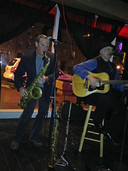 The attraction tonight was live music – our friend and neighbour Chris Plock was playing along with a guitar player. Chris sings and plays all the saxes and clarinet and flute. Steve on guitar also sings, and these guys sound great together. It was especially fun because some other neighbours, Kate and Leon and Jolene and Phil came too. (by the way I realized tonight that I haven’t exactly told my neighbours I’ve had this 27th Street blog going since we moved here several years ago….surprise!)