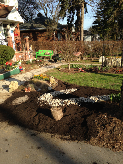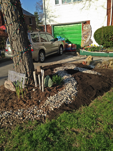 The tree garden had a river rock border and I extended that into the new garden making the stones into an S-curve. I still have to add a little more soil and also some more rocks, including some bigger rocks. Then comes the fun part, figuring out what to plant there. It’s a fairly inhospitable spot, with lots of tree roots from the locust, not to mention shade from the same tree. Suggestions welcome.