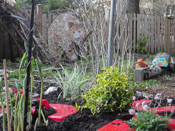 Last year at a so-called antique show, I bought a bunch of plastic letters. I’ve had in various places in the back yard. This particular garden is one I started last year as a veggie garden, but this year I’m planting mostly perennials. Tuffy P had the idea of using some of the letters to turn it into an alphabet garden.