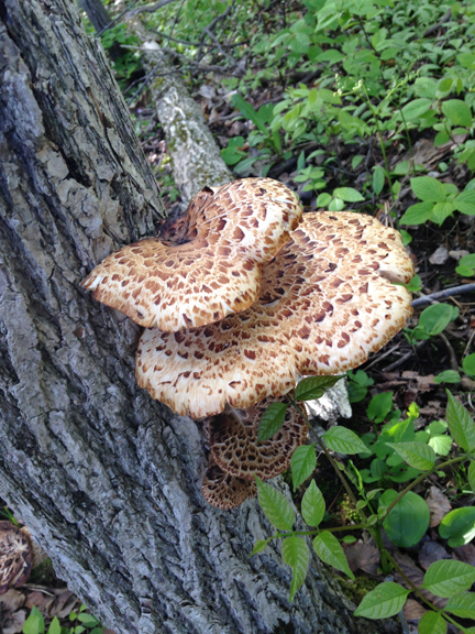 Polyporus sqamosus is commonly known as Dryad’s Saddle. I saw a lot of it while I was out foraging for morels today. It is quite distinctive and often has a watermelon-like odour. Apparently the young tender specimens are edible, and some people say they quite like them. I know one person who claims he ate some and became ill. I think most foragers do what I do and ignore them.