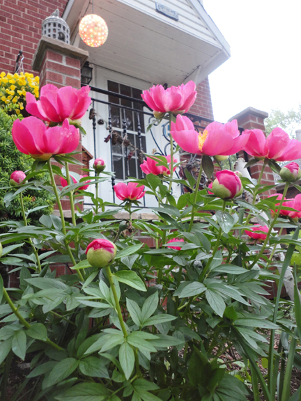 In my mind, summer starts when the peonies burst into bloom. This began today. This morning, they were tight little balls – on her arrival home from work this afternoon, Tuffy P announced they had burst, and rushed out with the camera. Our peonies start blooming several days after our neighbours’ flowers do – maybe because we have less sun, or maybe these are a slightly later variety. I really don’t know.