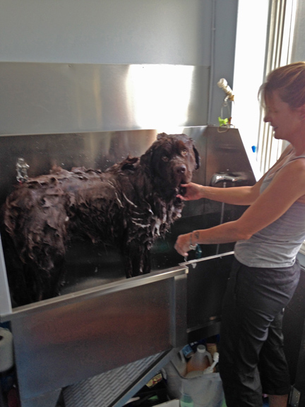 This morning I took the Newfs up to see Lorraine, who operates Peticure, to get them groomed. Lorraine is a fabulous groomer who has been keeping our dogs looking great for years. When we first met her, she was running a grooming truck and she would visit our home and groom the dogs in the van out front. The van had a tub and a table-lift and its own water tanks. All Lorraine needed what electricity and she was ready to go.