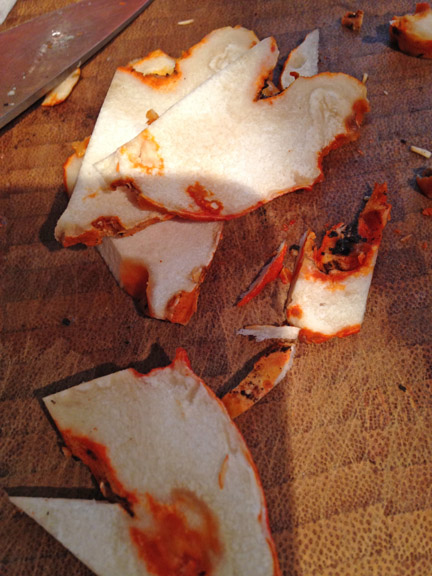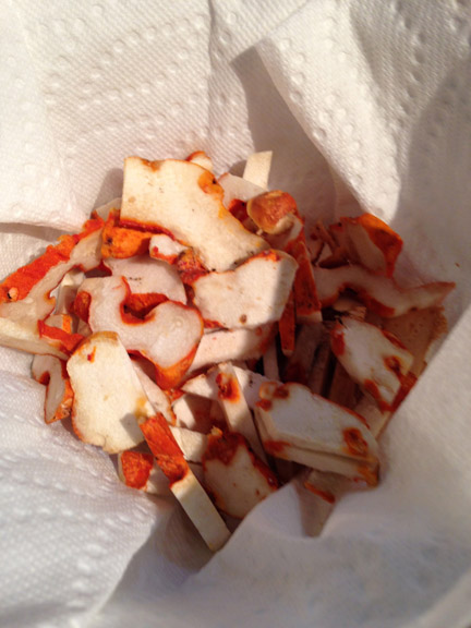 Then I cut the mushrooms into roughly eighth inch slices. My basic rule for lobster mushrooms is that I keep anything that is white or red and cut away anything brown or unappetizing.