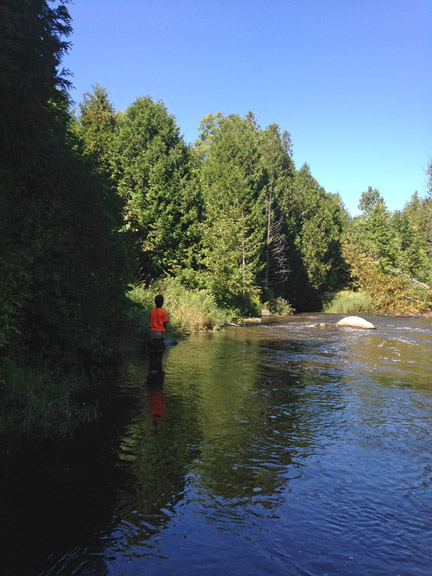 My neighbour’s son Ethan wants to learn fly fishing. I took him one day last year to the Grand River, and this spring I sent Ethan and family to a trout farm, where he caught his first trout on a fly. Today we went to an upper section of the Credit River so Ethan could get a little more on-stream experience and get an idea what it’s like fishing a stream.