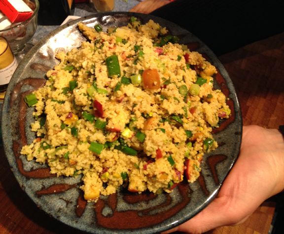 Chop up a half cup pistachios and about the same amount fresh mint. When the couscous is ready (10 min), combine apples, pistachios, mint, pinch of salt, with the couscous. Mix it all together and serve.