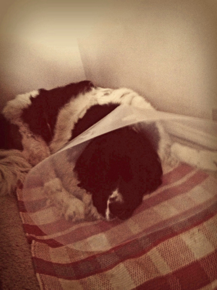 Memphis is doing well. She can get up and walk around some and she seems comfortable. This morning her bandage came off – and that means it’s time for the Elizabethan collar for a while so she doesn’t lick the incision. Memphis is not impressed but is tolerating it.