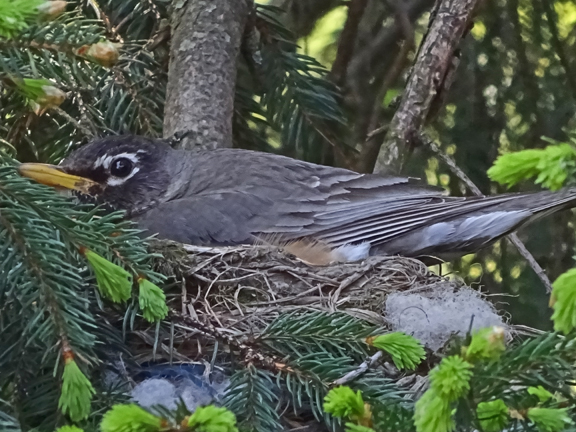 There is a broken robin’s egg on the ground underneath this nest. However, this bird continues to sit on the nest, so there must be others.