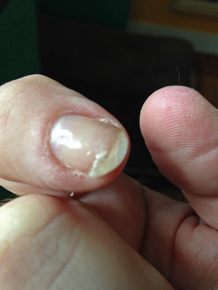 Clawhammer banjo is played by striking the strings of the banjo on the downstroke with the fingernail of either your index or middle finger. If you play a lot, your nails take a lot of abuse, especially if you use steel strings on your instrument. You don’t have to keep your nails super-long. I find that as long as my the tip of my nail extends beyond the pad of my finger, it’s fine. If my nails are a bit longer, I get better volume. Occasionally I have a nail disaster, as happened today while I was out picking some tunes on the porch today.