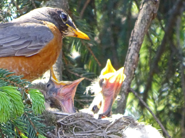 May 23, 2015 comment 0 Is it lunch yet? The baby robins are growing. They want lunch and they want it now. We can watch the action from our deck. The nest is in our huge Norway spruce. Share this:Share Click to share on X (Opens in new window) X Click to share on Facebook (Opens in new window) Facebook Click to email a link to a friend (Opens in new window) Email Click to print (Opens in new window) Print Like Loading... Related