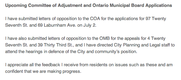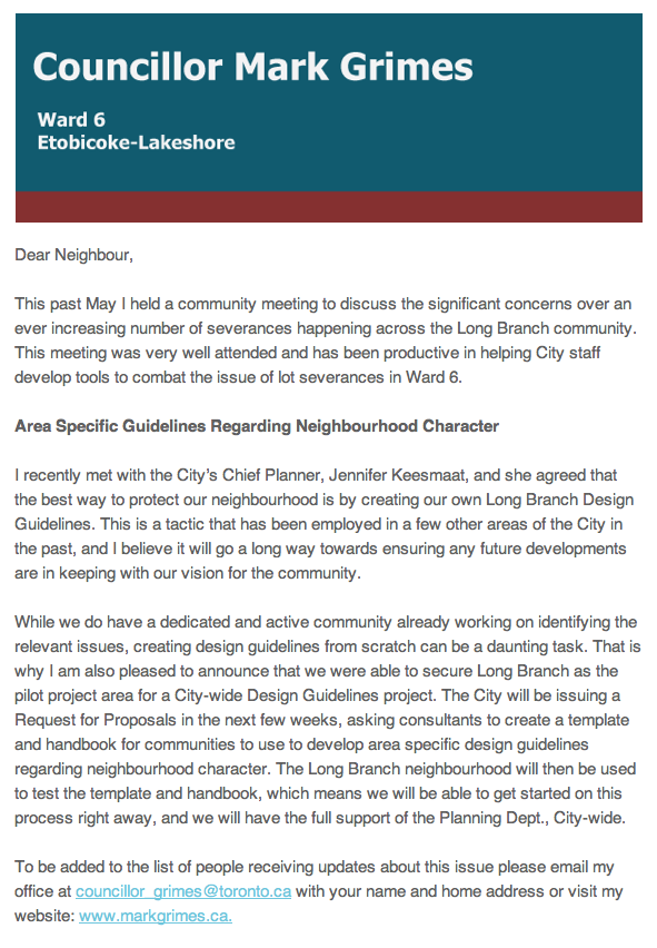 Thank you for posting this. I am also a resident of Long Branch and have a developer trying to rally support for a lot severance next door. I’m glad to know that there is some activity that is supporting the locals in preserving this beautiful neighbourhood.