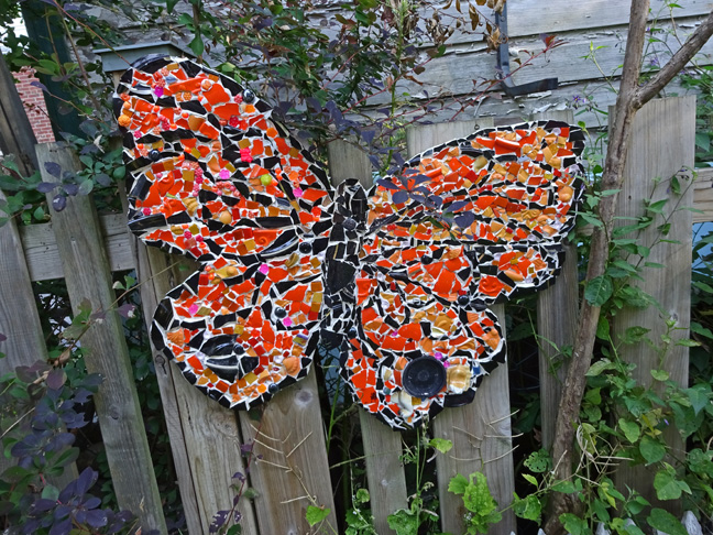 DSC00857Here is is in context on our fence, along with a painting Tuffy did for the garden a number of years ago. DSC00859Tuffy P says the next one is going to be irridescent blues.