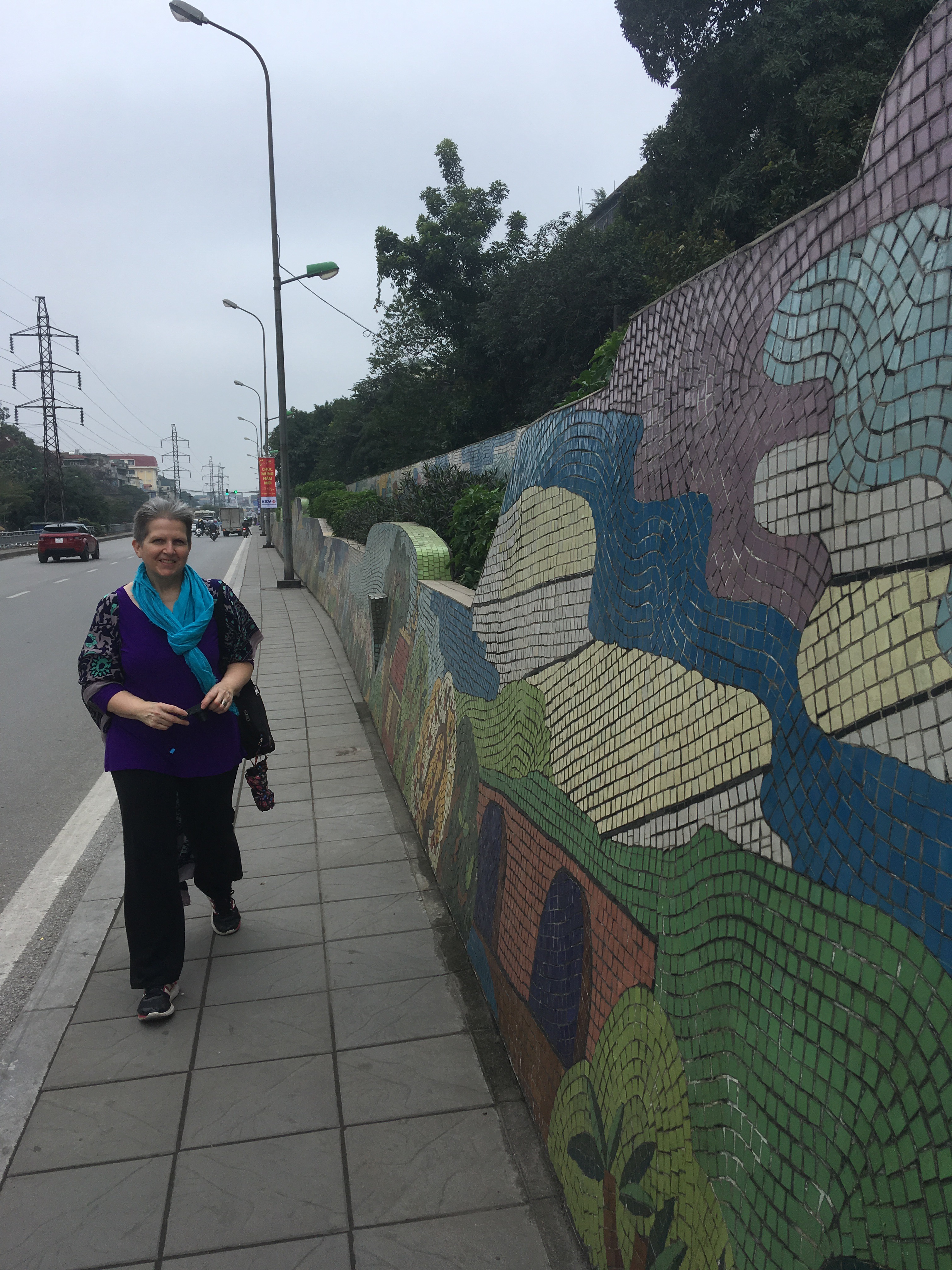 It runs along a busy roadway parallel to the Red River in Hanoi for 4 miles and it is spectacular. Nobody at the hotel knew what we were talking about, although I’d bet the people we asked had driven along it on their scooters many times. We had a cab drop us most of the way along the wall and we walked along it in the other direction.