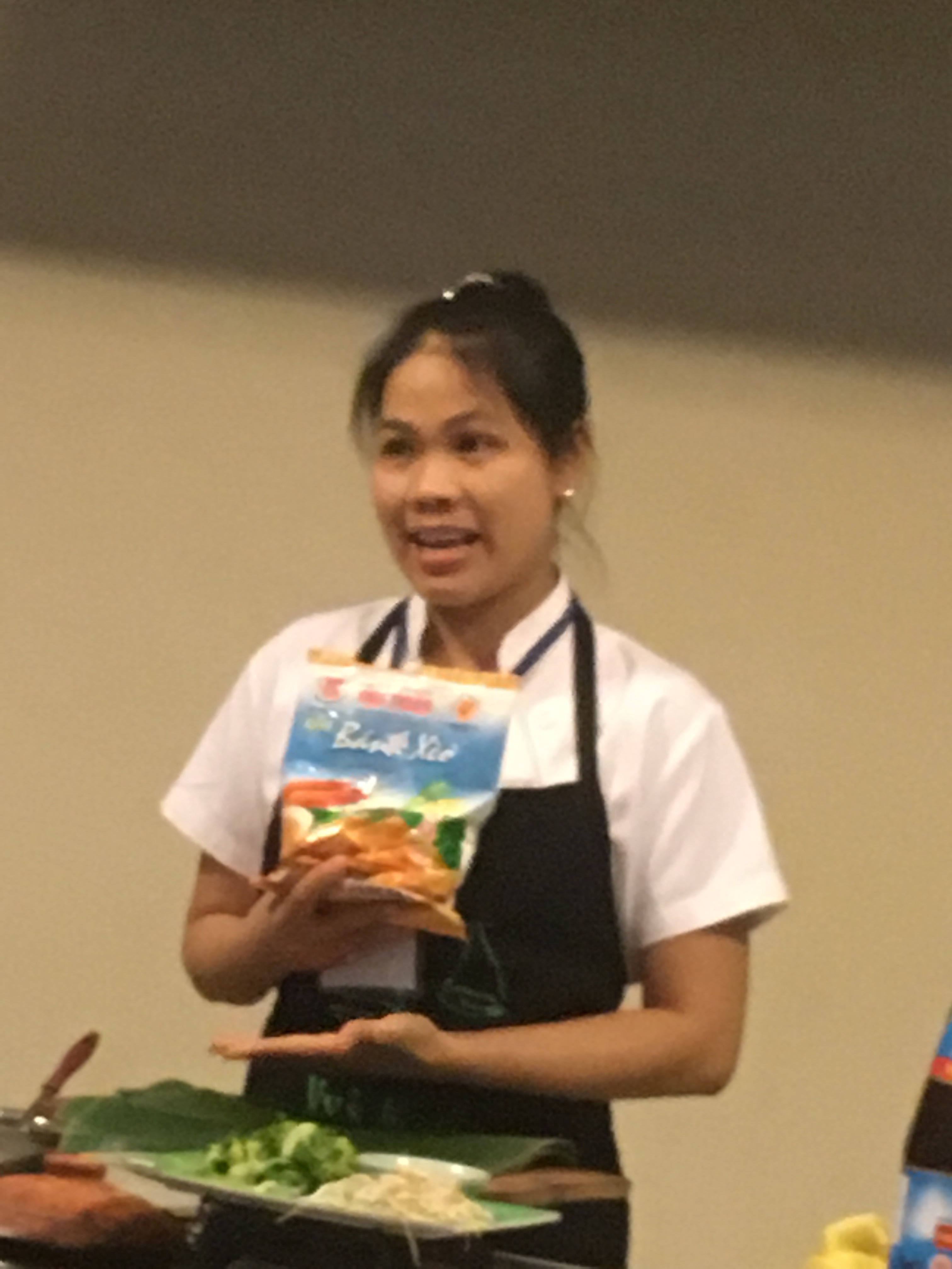 The next dish we made was banh xeo – sizzling crispy pancakes with shrimp and pork wrapped in rice paper. This is finger food. You dip it in the ubiquitous Vietnamese dipping sauce – fish sauce, lemon juice, sugar, garlic and chilies.