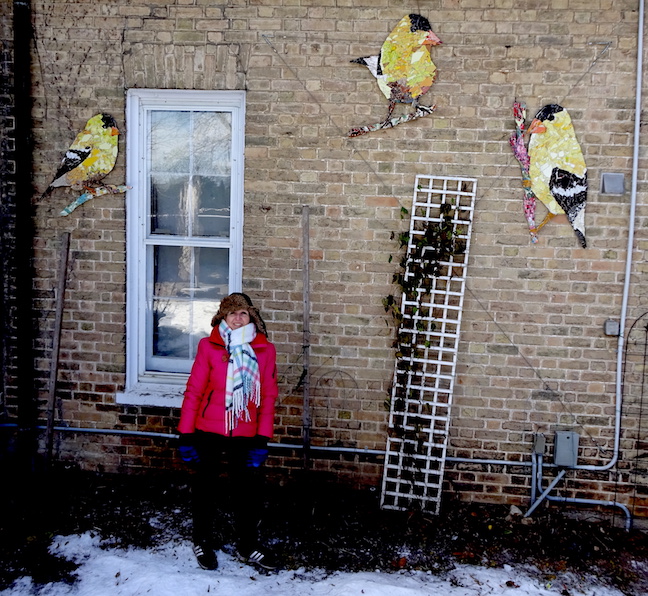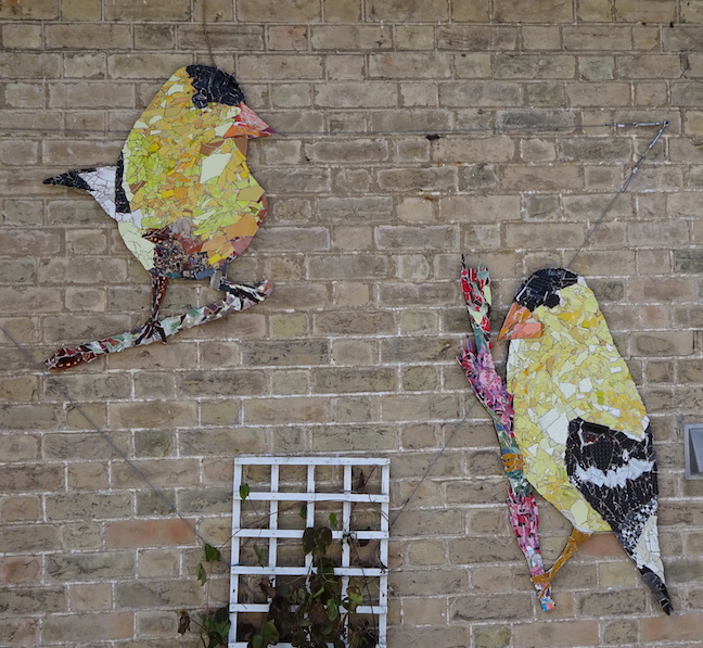 We just installed this little flock of goldfinches for a client in Paris Ontario. These were made with various materials, including broken crockery, erector set blocks and Smalti glass tiles. You can see many of our mosaic creations at the Long Branch Mosaics pages.
