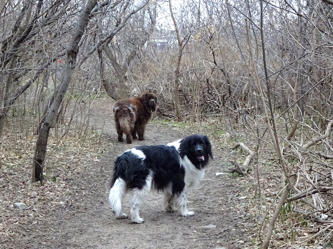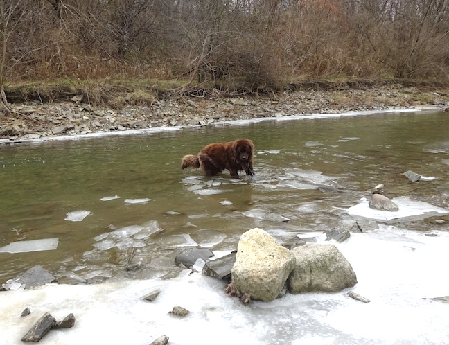 The Partners wanted to go somewhere (anywhere) in the car this morning and they started working me early. I took them to one of their fave places, the leash-free area along Etobicoke Creek. Ice was forming on the edges of the creek. I thought, no way any dogs are crazy enough to go swimming today. Wrong. They crashed through the ice, slipping and sliding, and splashed down into the creek.