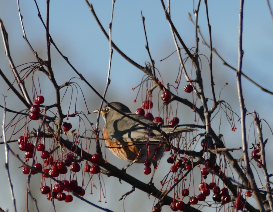 I did not see nearly as much bird-life as I saw the other day in the park. Somebody has a feeder set up near the parking lot, and there were some chickadees there, and a male cardinal, as well as a couple mourning doves walking around under the feeder. At the cherry tree, there were a few robins. I didn’t see any cedar waxwings (there were lots the other day). Also absent were mockingbirds and kinglets.