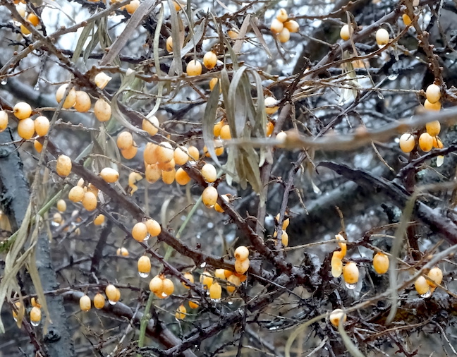 The plant I enjoyed seeing most this morning was sea buckthorn. There was one bush still full of berries. Sea buckthorn berries are edible and nutritious – but sour – and are good in baking.