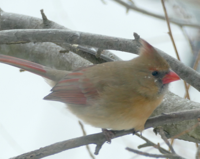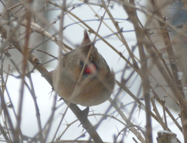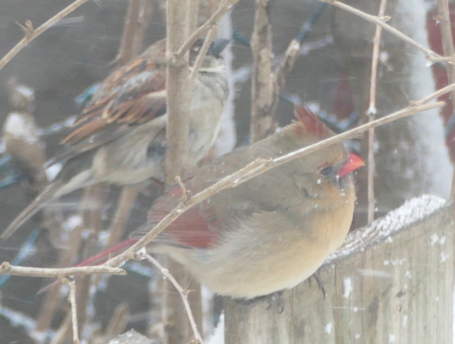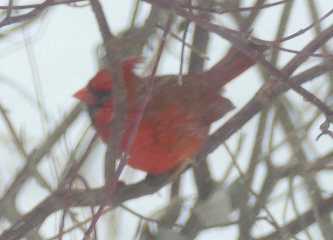 I tried to photograph the cardinals and sparrows from inside. I saw a mourning dove out front earlier but I don’t know where it’s hiding. When the storm was just starting, several chickadees came to the feeder to grab some calories before it got too bad. No sign of the house finches today.