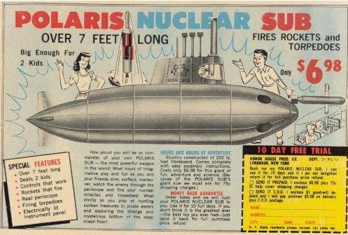 I really wanted one of these when I was a boy. I imagined zooming around in Grenadier Pond, firing rockets and torpedoes at imagined enemies. Mom said no.