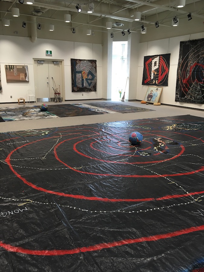 The exhibition features a huge labyrinth floor painting called OBOR, referring to the Chinese, Russian and Eurasian bear or “the New Silk Road system” linking the Atlantic and the Pacific. This work was painted on a black tarp with oil markers, enamel, spray + has fish decals by Jenny Chen. Viewers are invited to take their shoes off and walk on this and the other floor paintings.