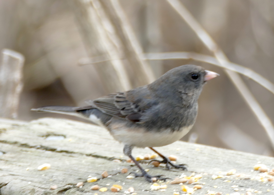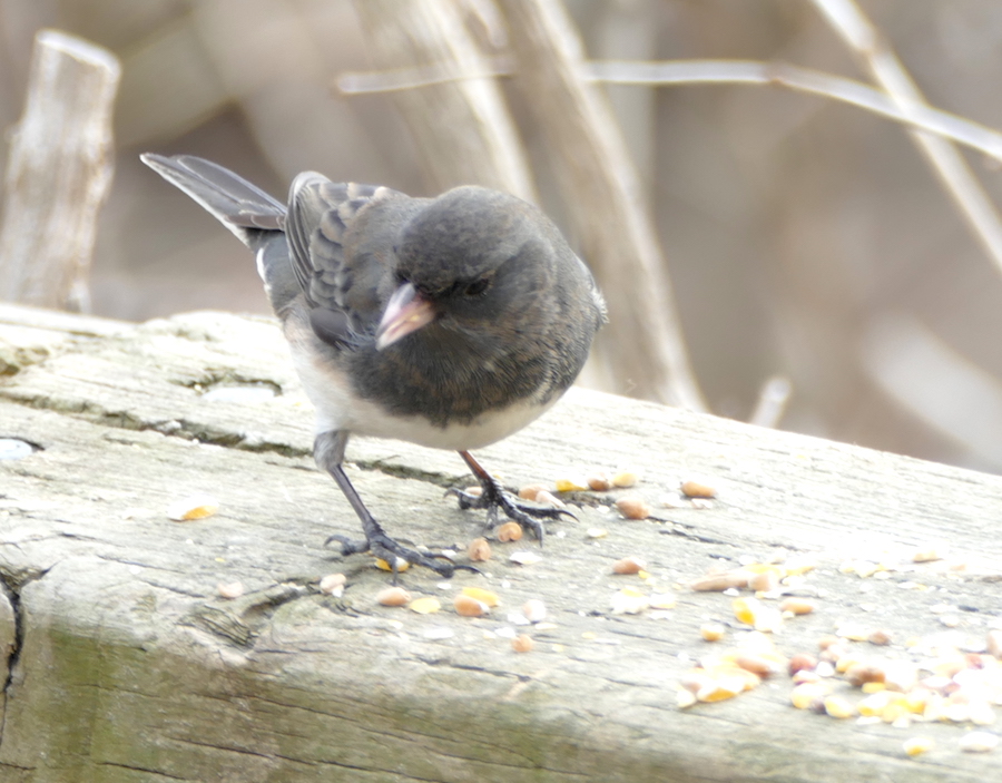 There is a railing along the path near the river where people put out food for the birds. Dark-eyed juncos were really enjoying this treat today.