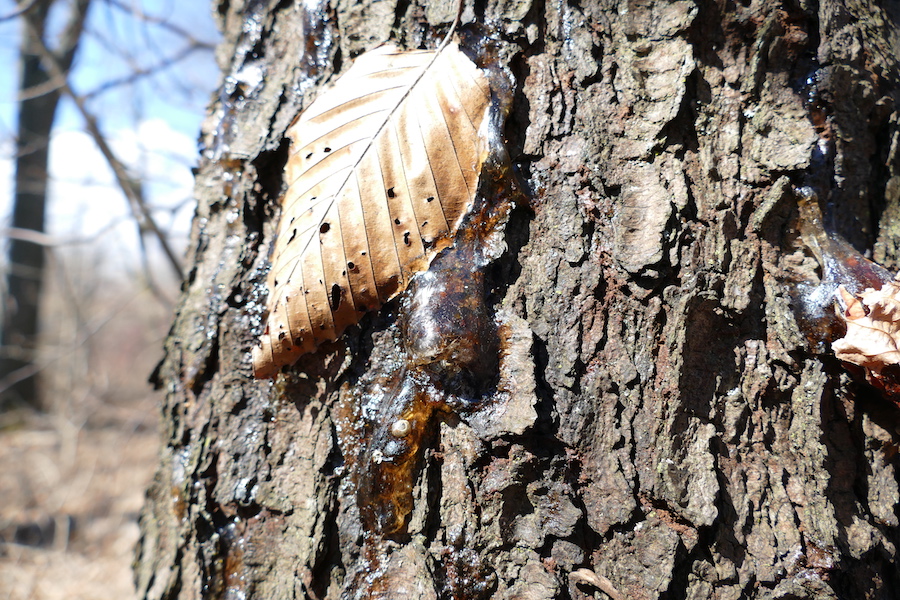 Early spring is an interesting time to look at trees, using the bark and the buds as well as the shape and stature of the trees to identify them. Above, Miles is showing the distinctive bark of the hop hornbeam (sometimes called ironwood). Below you can see a far different looking bark. It’s black cherry, whose bark Miles compares to burnt cornflakes. This particular black cherry has a lot of dripping sap happening.