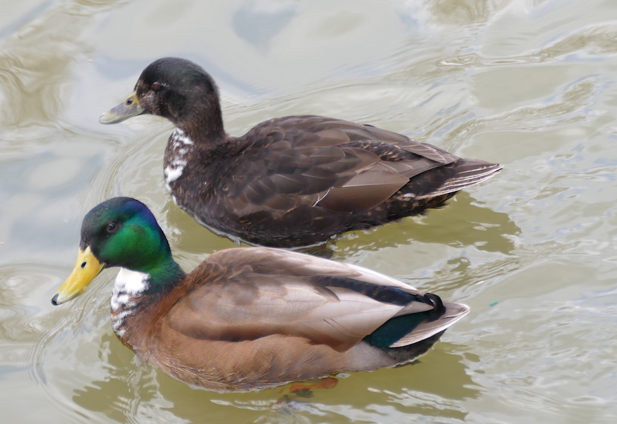 There were a few ducks around, mostly mallards, but also a couple golden eyes and a wood duck. The ducks in the photo are hybrid mallard/black ducks, often called bib ducks.