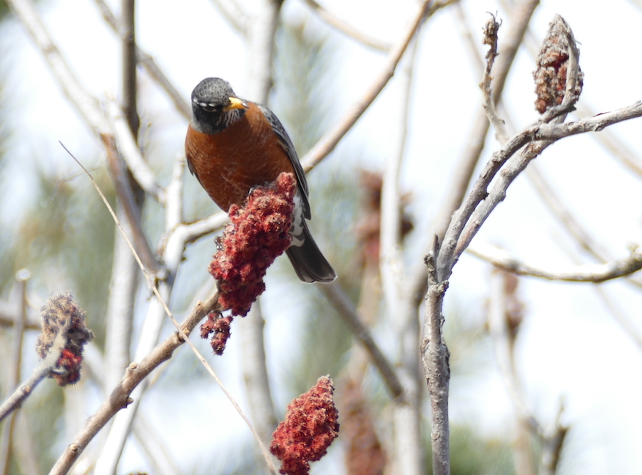 And here’s an American robin, enjoying a staghorn sumach.