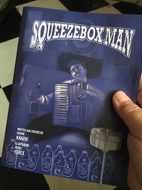 I’ve been working with Jacob Yerex on a graphic novel (in 6 issues) based on my little book of stories: Squeeze Box Man: The Lazy Allen Stories. We’ve just got Issue 1 back from the printer, and I’m really charged up about it. We’re aiming to get these into some comic book stores soon and they’ll also be available from me through 27th Street.