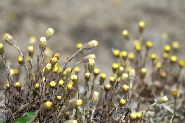Colt’s Foot is one of the easiest to identify spring flowers. It’s a yellow flower that appears without any leaves. After the flowers die away, the distinctive leaves appear.