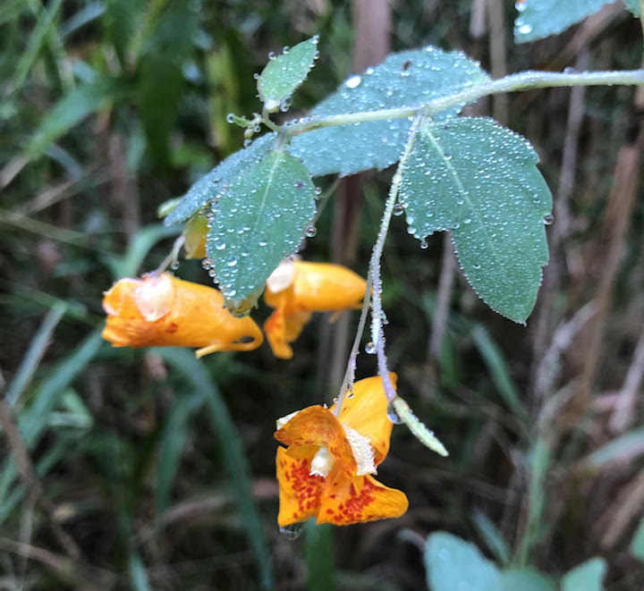 This morning I enjoyed a stroll along the Humber River. There was Spotted Jewelweed (Impatiens capensis) in bloom along many of the paths. I love these little flowers, delicate golden yellow blooms decorated with bits of fiery red.