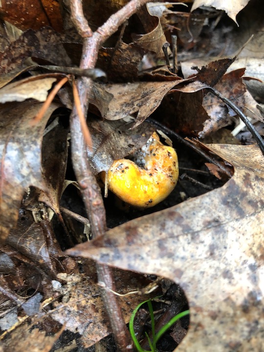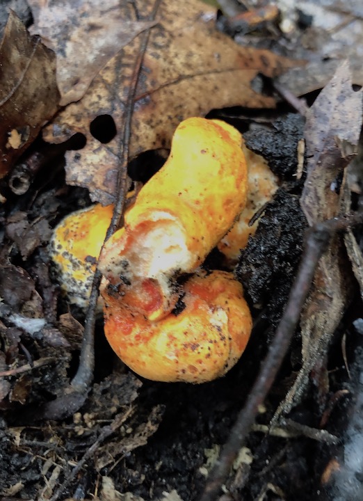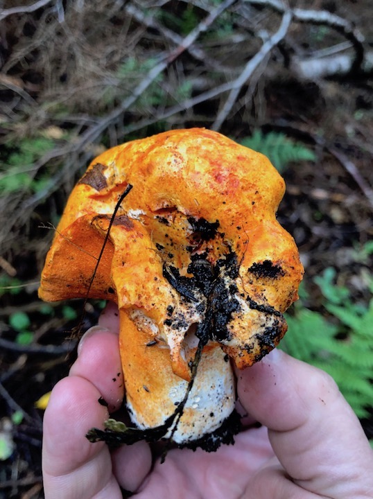 Lobster mushrooms occur as a result of a cup fungus attacking a host mushroom. There are two hosts, both unpalatable white mushrooms. Once attacked, the white mushrooms often become contorted and they turn the colour of cooked lobster shells – and they become a choice edible.