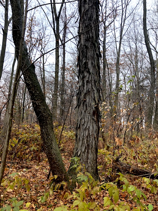 The tree on the right is very distinctive. I can’t think of another like it. It’s a shagbark hickory. The bark is indeed shaggy, isn’t it? This is a good time of year to have a close look at this particular tree in Marie Curtis Park. It is guarded by many prickly blackberry bushes, and the cost of getting a close look is measured in scratches.