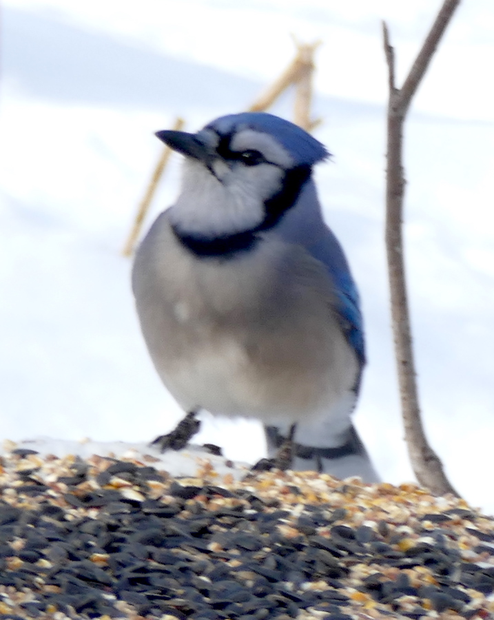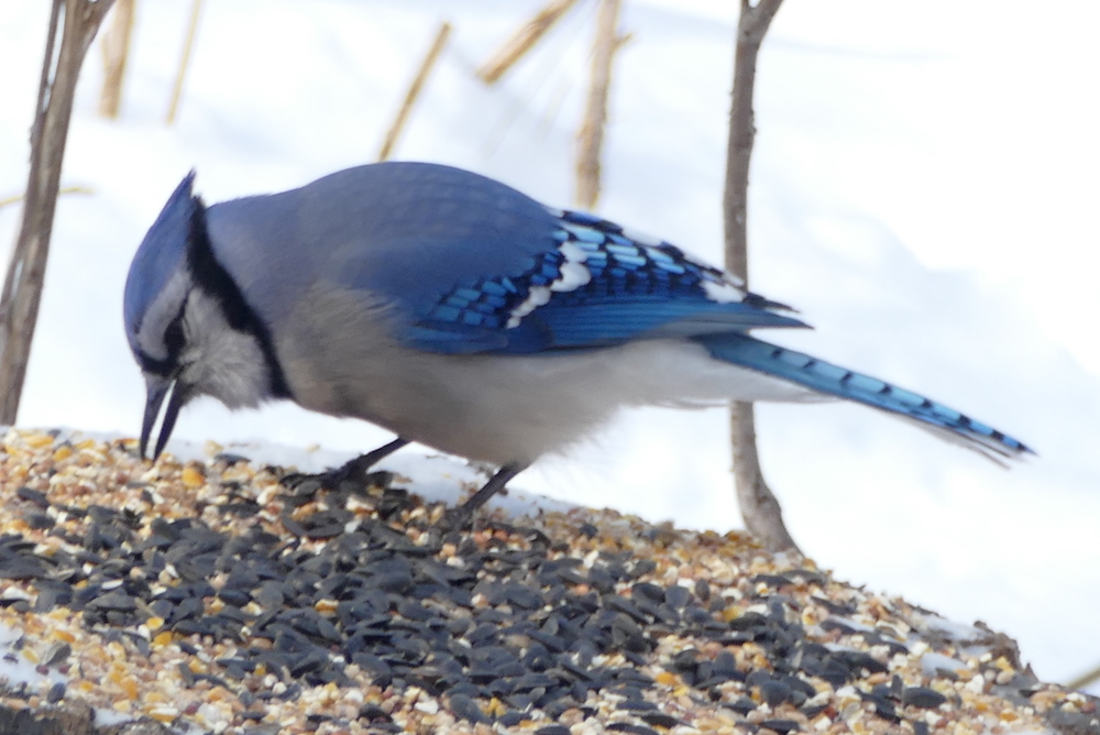 We watched some groups of blue jays in the trees and around a feeder in the woods.