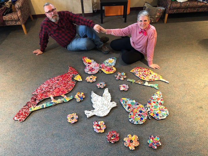 We just completed 5 mosaic-making sessions, working with seniors at a long-term care residence. We created the templates, prepared the materials, spread the glue and provided plenty of coaching and instruction along with way. The photo above shows the work they accomplished during the 5 sessions. None of these people had ever done any work like this before.