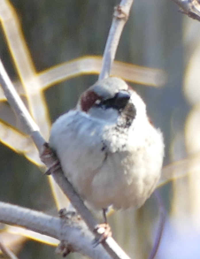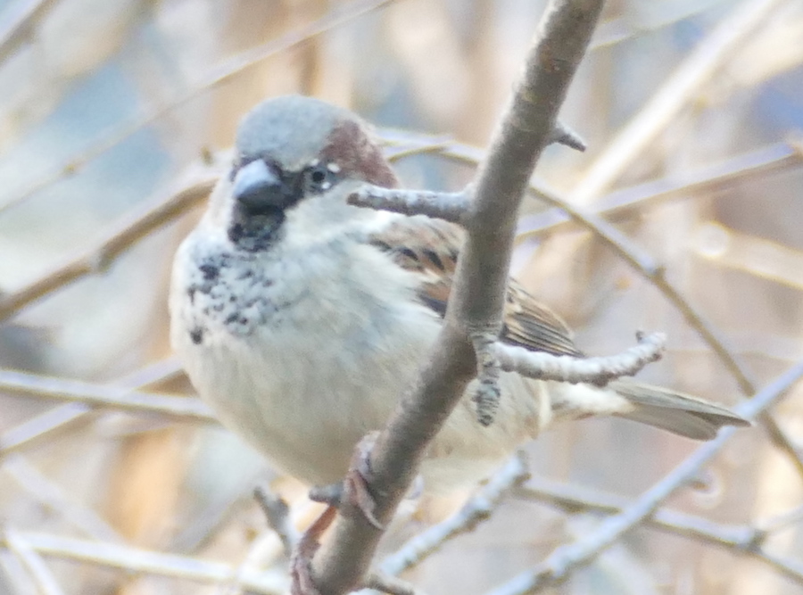 This morning while I was enjoying my granola, I watched 2 pair of cardinals out back, along with several house finches, a chickadee, a few red-winged blackbirds along with the resident colony of house sparrows. I left to get a filling replaced at the dentist, and on my return, the house sparrows were sharing the apple tree with grackles and starlings and that’s it.