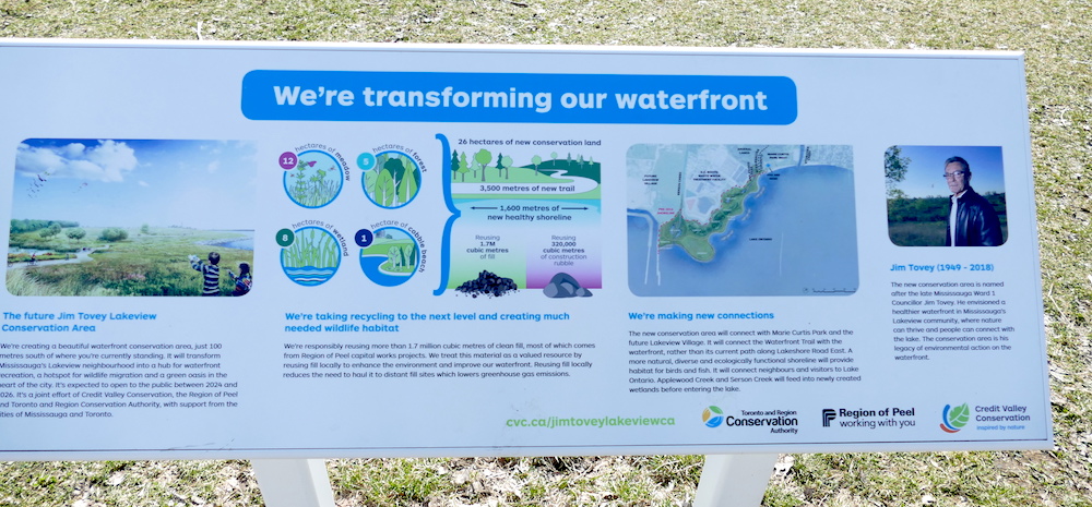 I walked along the Lake in Marie Curtis Park. For months there have been diggers over to the west moving fill, gravel and rocks around. There is a sign up now. It turns out a new conservation area is being created. They even have a politician to name it after.