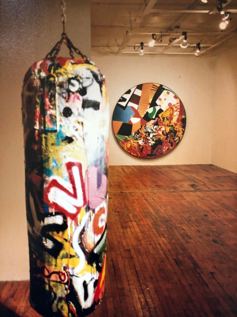 The piece in the foreground was done on a 90 pound punching bag. It’s suspended from the ceiling in the gallery. I think we still have that one in storage. The piece in the background was also exhibited at the Art Gallery of Mississauga. A fellow named Elo Jessen rigged up this tondo for us with a little motor, such that it rotated very slowly, so slowly in fact that unless you were in the gallery for a few minutes you might not notice the movement.