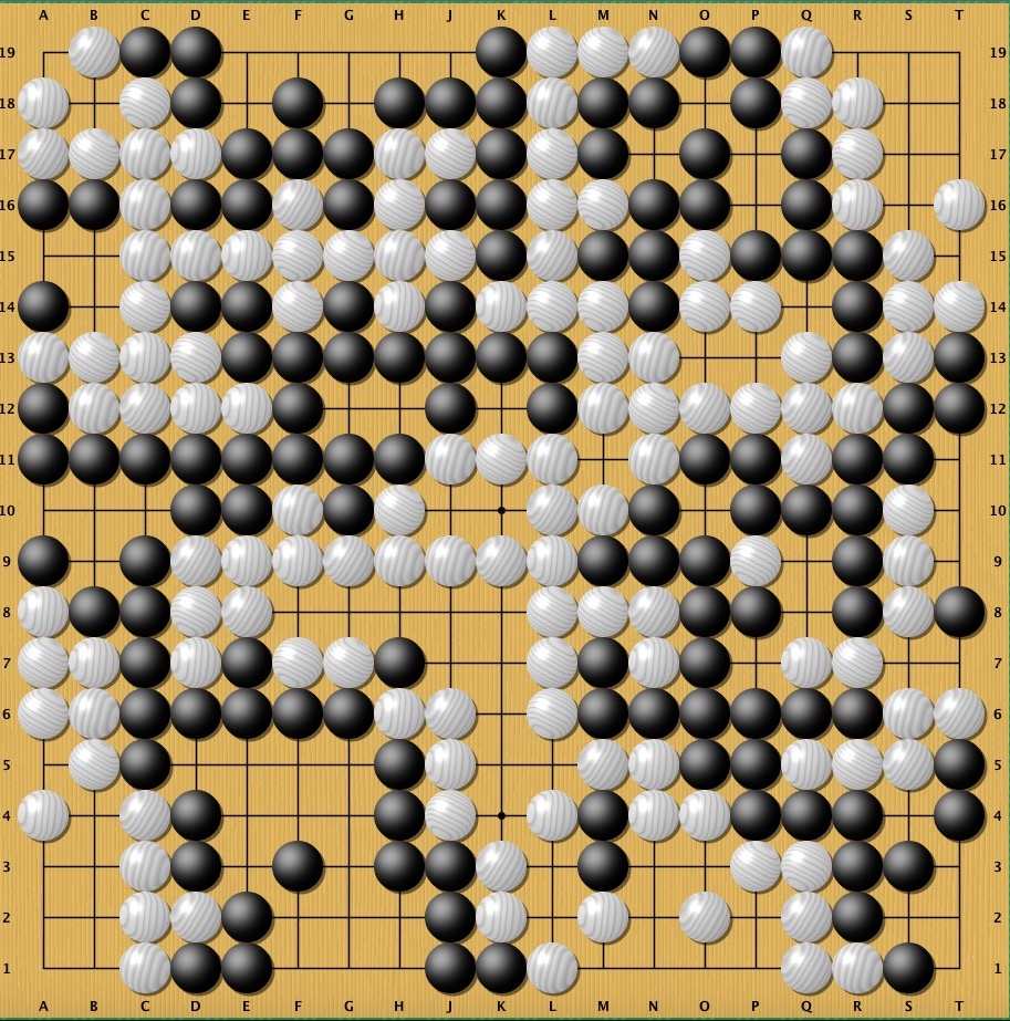 I played 7 online games of Go with Vox last evening, in which I continued to give him 2 stones handicap (I took 6.5 points komi). I had a successful session, winning 5 of 7 games, but that score is not indicative of the competitiveness of the games. Vox’s wins were both decisive. As well, I won 3 games by a total of only 6 points, while my other 2 wins were significant. In other words, 3 of the games were really up for grabs, decided by tiny margins. Certainly, being able to find that little edge in a very close game is a part of the game. Sometimes every point counts. Still, it’s fair to say that Vox played stronger last night than he has in recent sessions. I found it more difficult to destabilize his groups and to attack effectively. We had a couple very interesting ko battles, one that I won outright and the other one Vox won, but not before giving up some stones as compensation.
