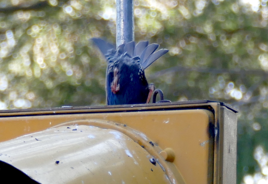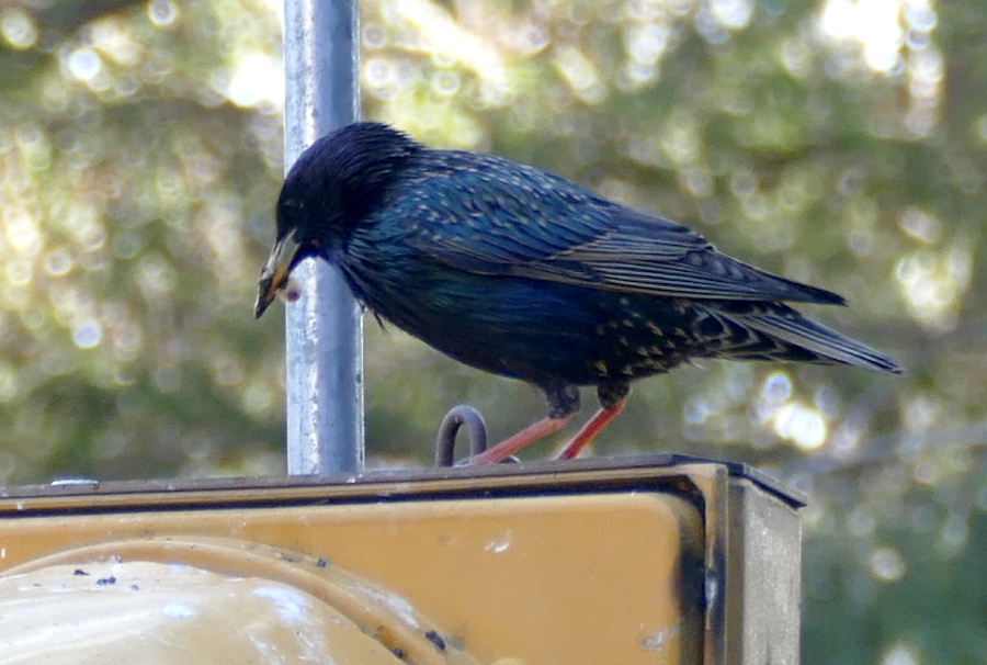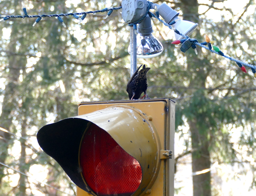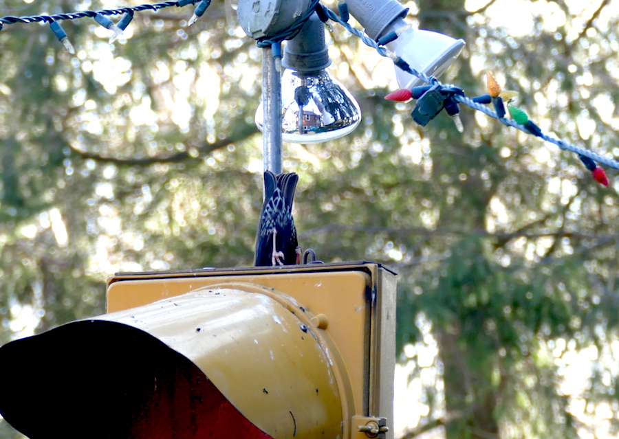 Somehow or another we wound up with a traffic light on our back deck. It’s been rewired along the way so that when plugged in, all 3 lights come on. One spring a starling couple found the hole in the top of the light box and decided to set up an apartment in there. Since then, we have them nesting in the traffic light each spring. We never plug it in during nesting season. I don’t know if it is the same pair each time, but I imagine so.