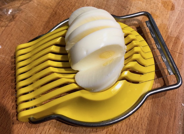 We usually have some hard-boiled eggs in the fridge (in our case hard-steamed eggs). There was one left so I sliced it up. I’ll have to steam up more tomorrow.