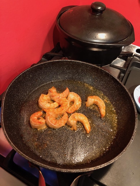 We have a bag of shrimps in the freezer. I took the shells and tails off several of them, seasoned them with cayenne and garlic, then sauteed them up. They only take a couple minutes to cook.