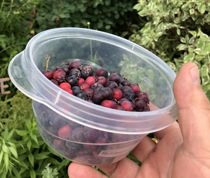 Do you call them Saskatoons or Serviceberries? Either way they’re delicious. We have a bush in the front garden and today was my first berry-picking of the season. Judging from the number of berries on the bush, I’d say I’ll get at about 2 weeks of picking the ripe ones each day.