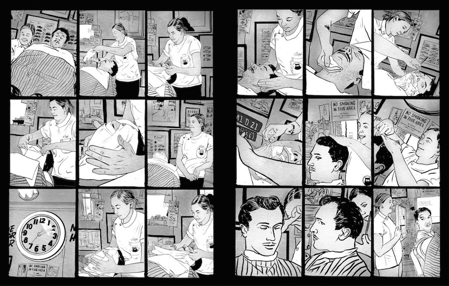 Lazy lives in Long Branch, coincidentally the same Toronto community I live in. Jacob (who illustrates the novel, bringing my characters to life) and I chose to set this story in an actual Long Branch barber shop called The Nite Owl. This location has been a barbershop since the 1940s. After the original crew retired, it was closed for a decade then reopened as The Nite Owl – a fantastic old school barber shop (where it happens I get my hair cut). We asked my barber Steph if she would like to be in a graphic novel cutting Lazy’s hair. Of course to do so she would have to go back in time to the early 80s, but fortunately, Steph was up for some time travel.