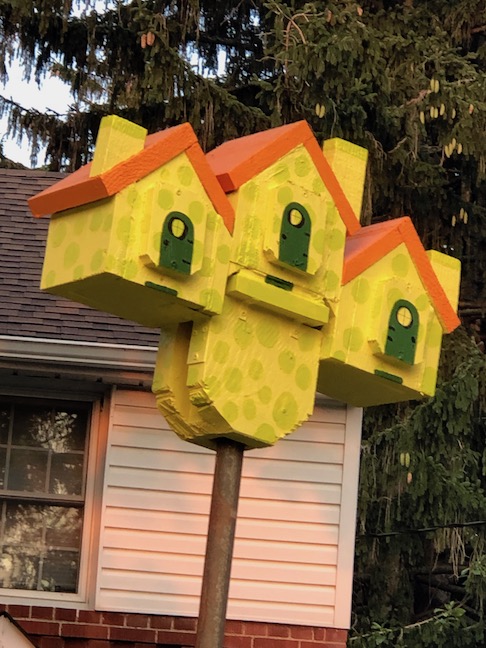 Tuffy P did the paint job on this housing complex. I just put it back on the pole. House sparrows will use it for shelter and then will nest in the apartments in spring. Hopefully house sparrows enjoy polka dots.