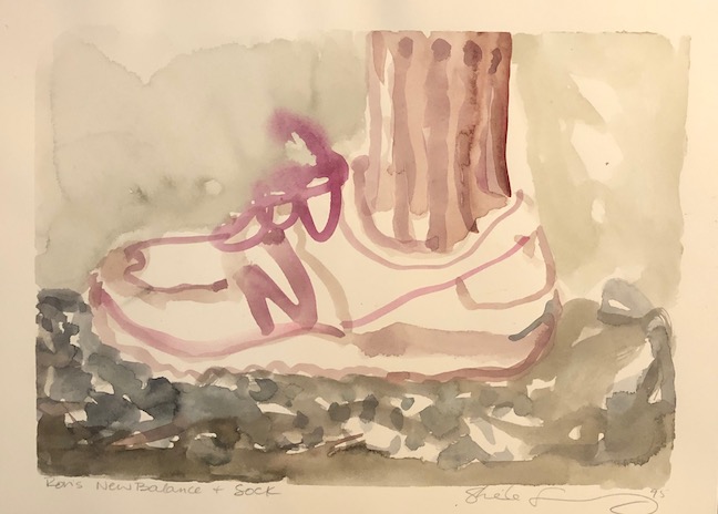 Sheila recalls that she painted Ron’s shoe on one of the last painting trips we were able to take with him. He was experiencing neuropathy which made walking the woodland trails increasingly difficult. One day, instead of the desert boots he favoured, Bloore was sporting a pair of brand new New Balance shoes which offered him additional support.